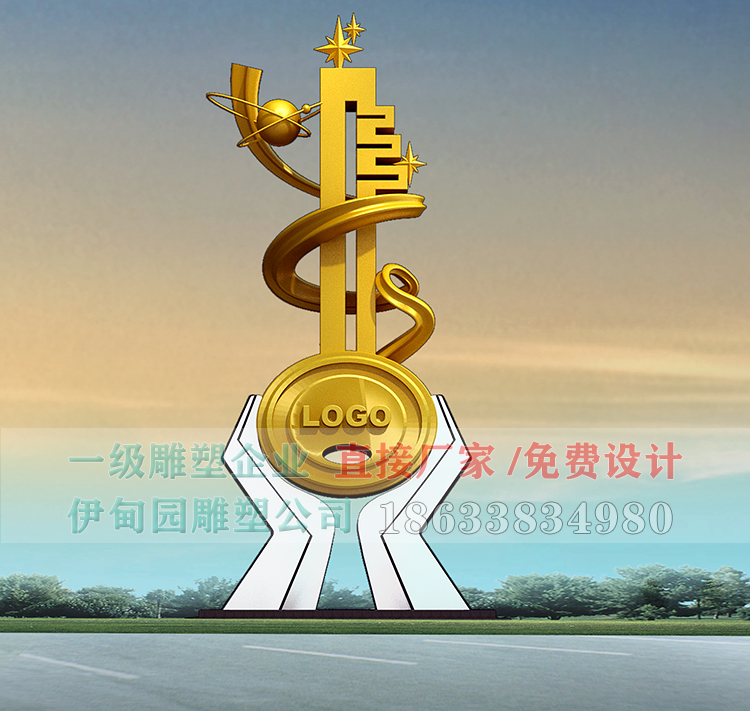 不锈钢钥匙雕塑,以钥匙、双手、彩带、宇宙、五角星为设计元素。