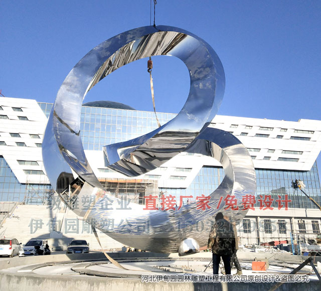 水纹镜面不锈钢雕塑,高11米,宽9米,安装于吉林省某学校。雕塑从设计→订制小样→主体制作→物流运输→现场安装→细节处理,共历时3个月。不锈钢雕塑主骨架采用219*6mm镀锌钢管制作,防腐性能好、牢固稳定!所有承重骨架采用双面满焊,整体骨架完成后用防锈漆满涂三遍。雕塑外轮廓为抽象e造型,外部装饰板采用304#钢板,紧贴着骨架外形进行拼装,焊接。