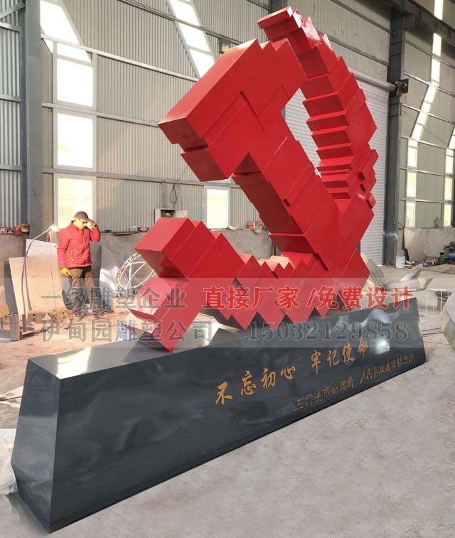 不锈钢党徽雕塑制作流程:雕塑骨架采用钢筋与不锈钢管焊接组成,结实稳固,确保雕塑永久使用不变形的目的。